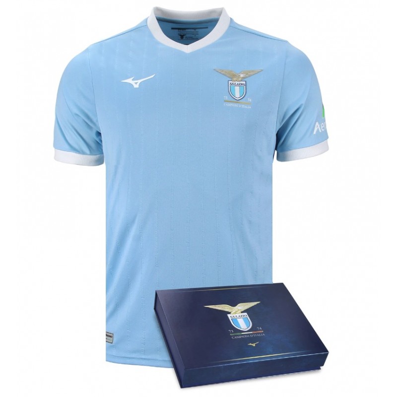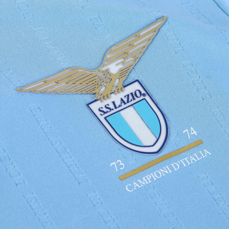 La quarta maglia ufficiale di S.S. Lazio 2023/2024 è prodotta da Mizuno e fa parte del kit in edizione speciale ispirato alla divisa indossata dai Campioni d'Italia del 1973/1974 per celebrare il 50° anniversario dalla vittoria leggendaria dello scudetto. La maglia riporta sul davanti il nome scritto in rilievo e verticale di ogni membro della gloriosa squadra, creando così un motivo a righe in stile gessato monocromatico. L'azzurro riprende la tonalità della divisa degli anni '70 che, insieme al bordo a coste sulle maniche e lo scollo a V, conferisce al design un tocco retro. La maglia celebrativa sfoggia lo stemma gommato della Lazio sul petto, con sotto 'Campioni d'Italia' e si presenta in un lussuoso packaging da collezione.
