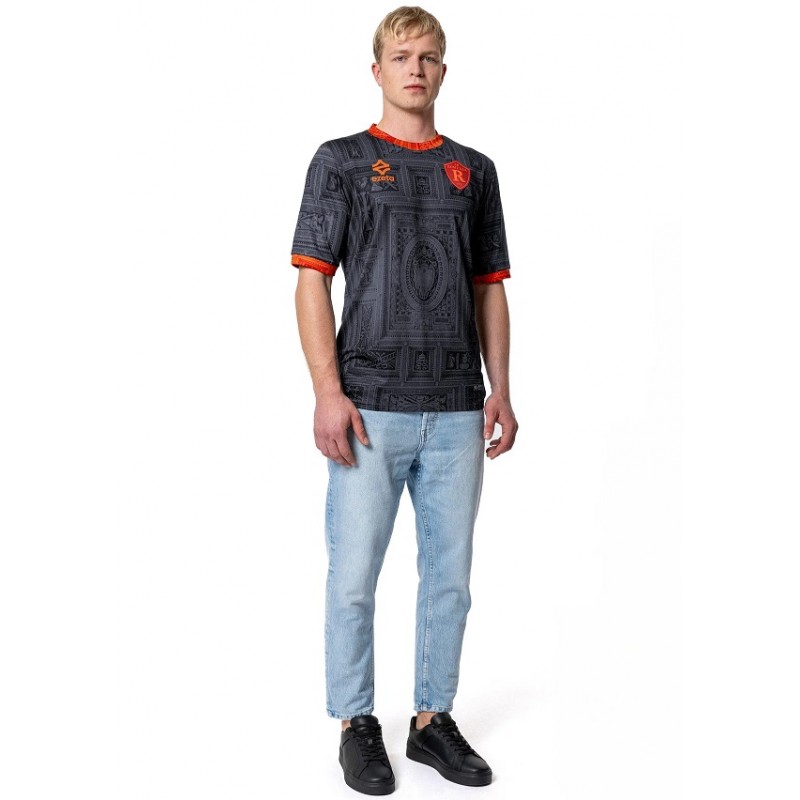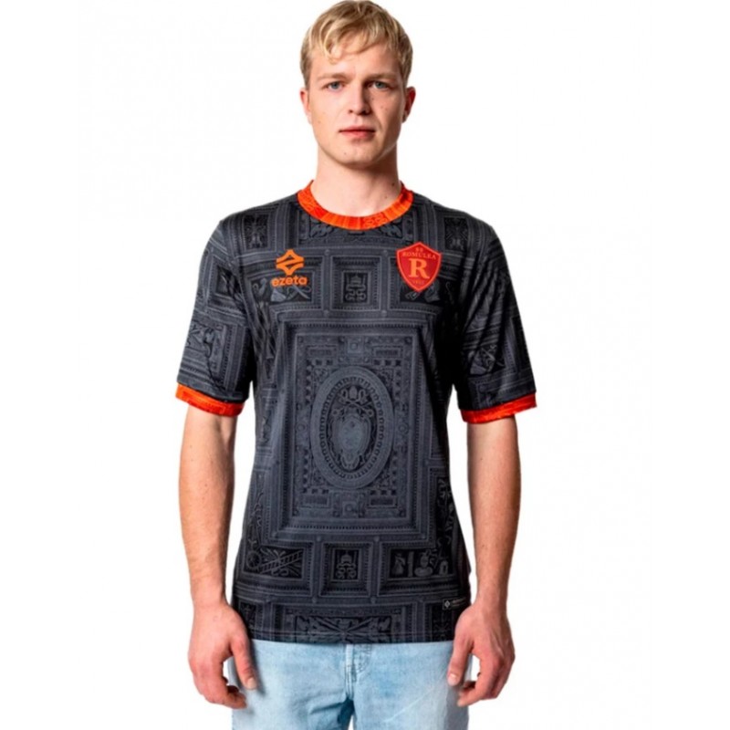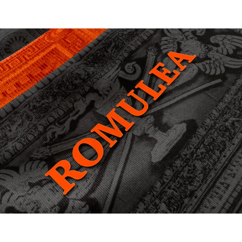 Dettagli Prodotto: Vestibilità Slim Fit - Tessuto morbido ed estremamente elastico e leggero - Fascia centrale cucita con stampa a contrasto - Colletto e bordo manica in costine elasticizzata personalizzata a contrasto - Stampa all over su tinto vasca viola - Stemma ROMULEA in silicone 3d con base in tessuto viola - Logo ezeta in Silicone 3d bianco Etichetta “Authentic" in transfer hd silver